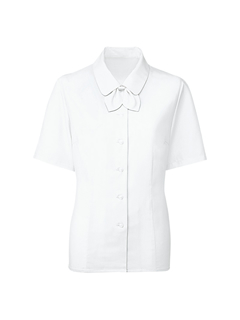 白さにこだわった清潔感のあるブラウス。光沢感とお手入れの簡単さが魅力のポリエステルをベースに、綿の風合いをプラスしました。